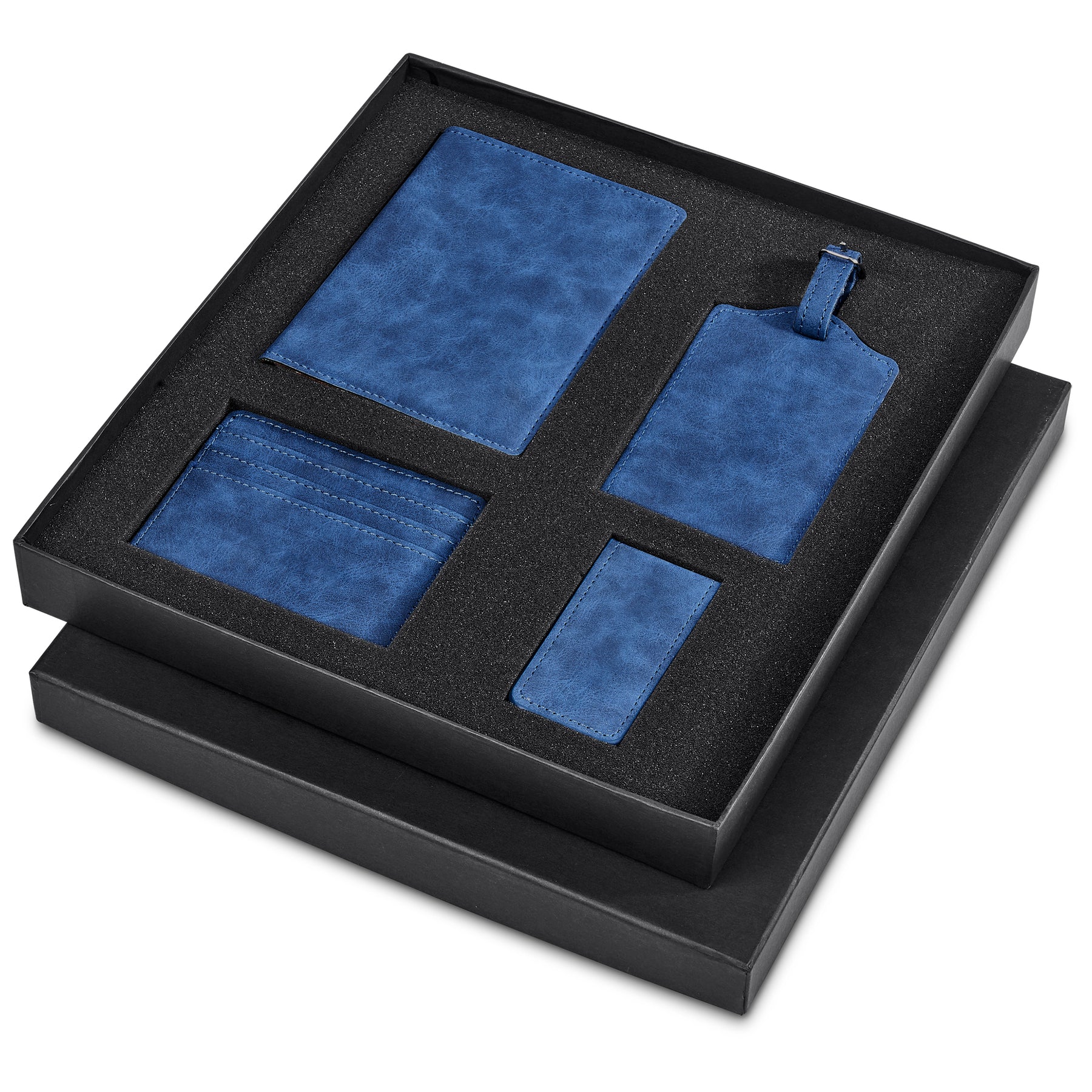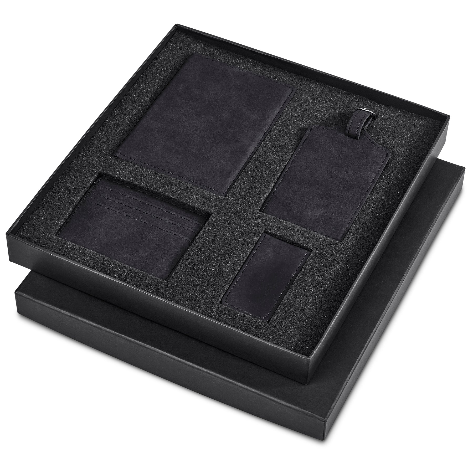 This travel set includes a passport holder, luggage tag, card holder, and money clip, elegantly presented together in a black two-piece gift box. Each item is securely held in place by a custom sponge tray, ensuring a stylish and organised presentation. The 4 items are designed for debossing branding with the same logo of the same size on each item, to save on producing multiple dies.